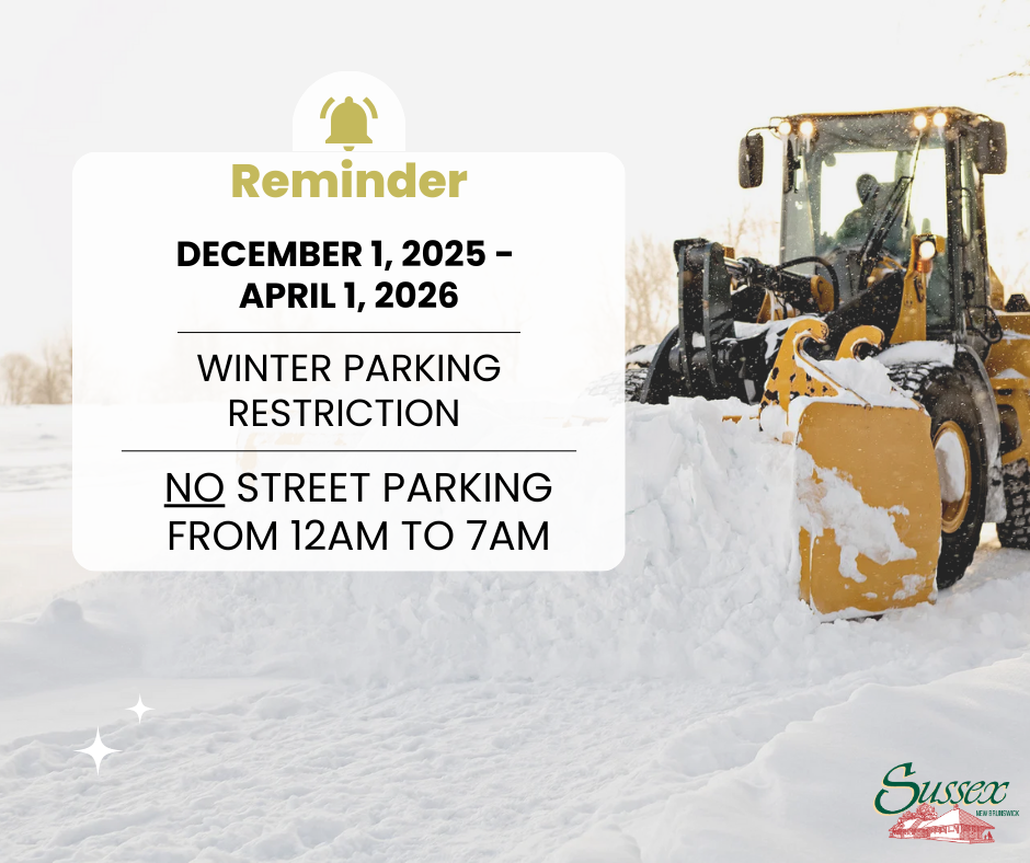Sussex wishes to advise residents and visitors that the annual Winter Parking Restriction will be in effect from December 1, 2025, through April 1, 2026.
