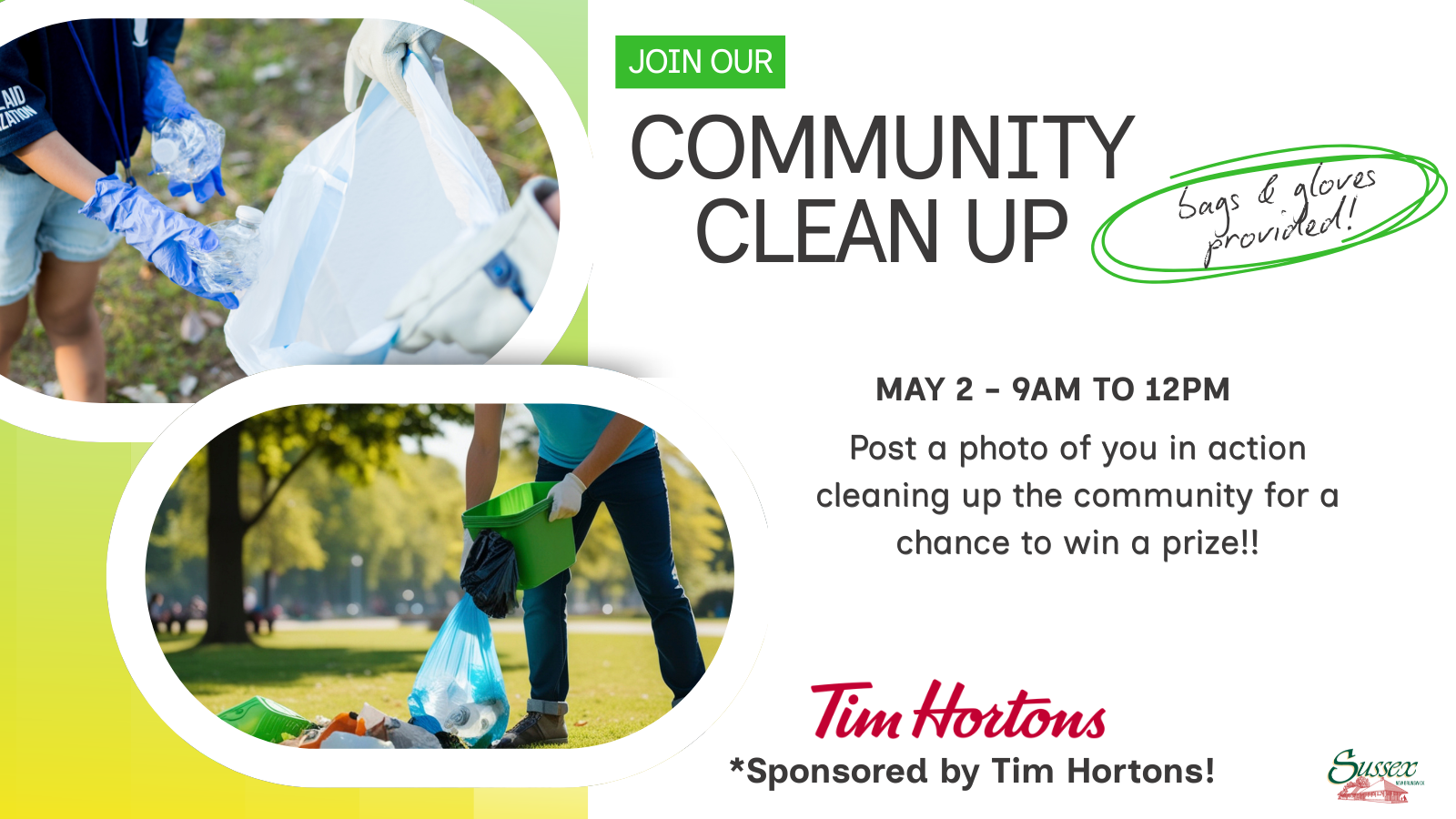 Join us for our Annual Community Clean-Up, proudly sponsored by Tim Hortons! Share a picture of you and your clean up crew for a chance to win a prize!!!!