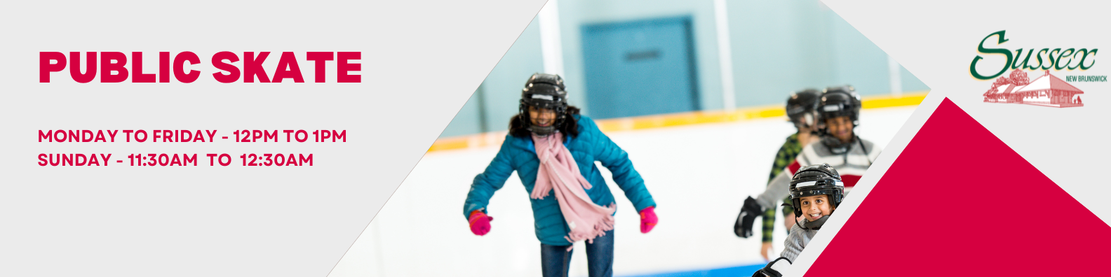 Lace up and join us for FREE public skating! Everyone is welcome Monday to Friday from 12PM to 1PM and Sundays from 11:30AM to 12:30PM.